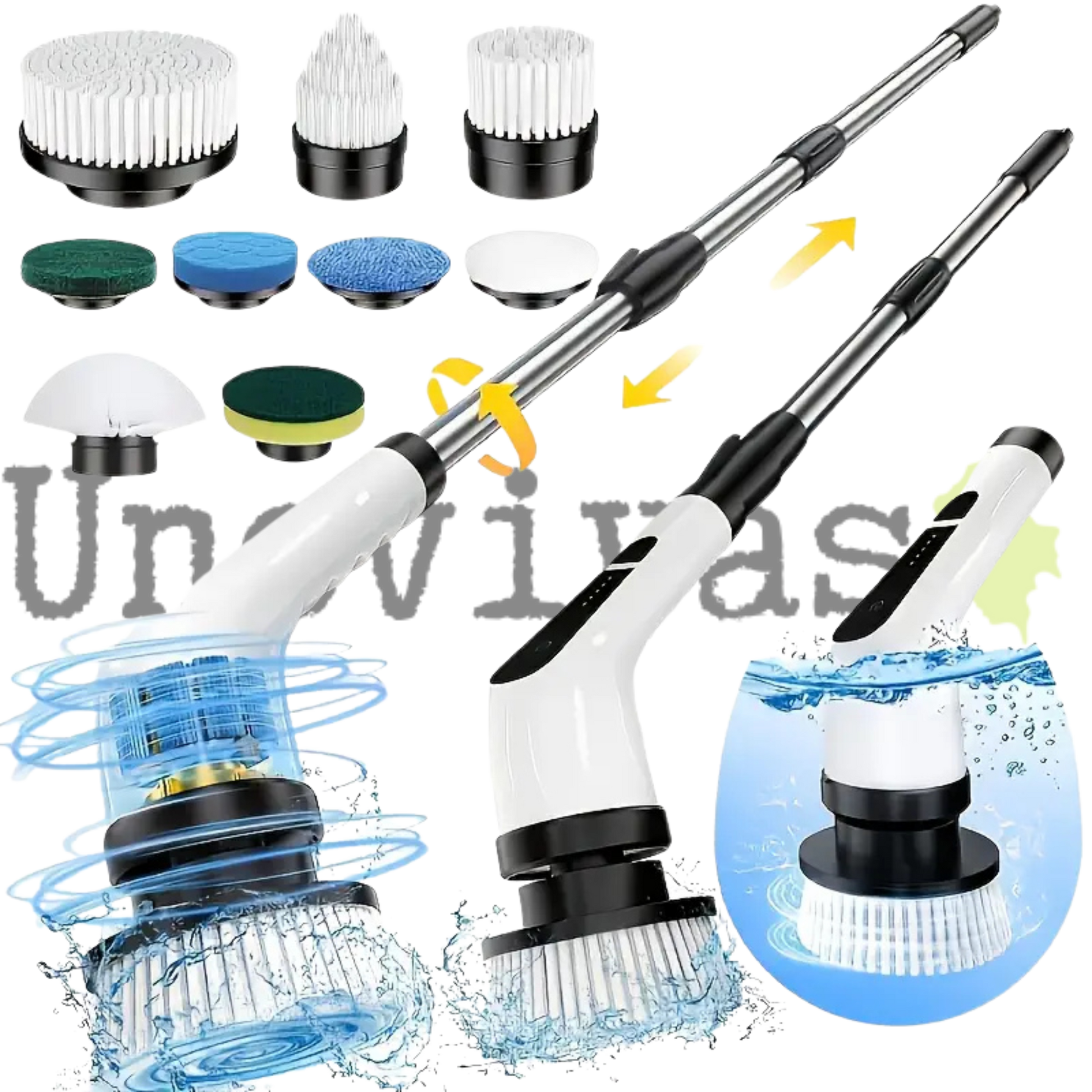 El kit completo trae: 1 cepillo eléctrico, 7 cabezales de limpieza, 2 mangos ajustables, cable USB y manual de usuario.
